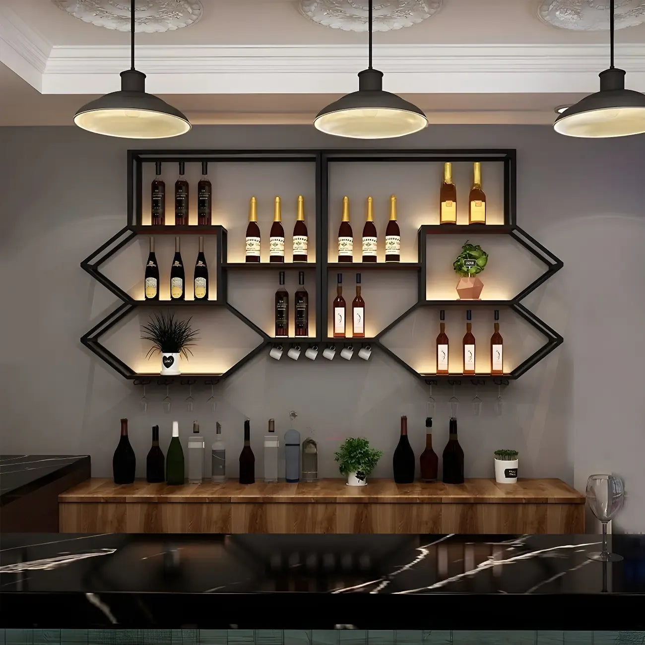 Porte-bouteilles mural lumineux en métal noir