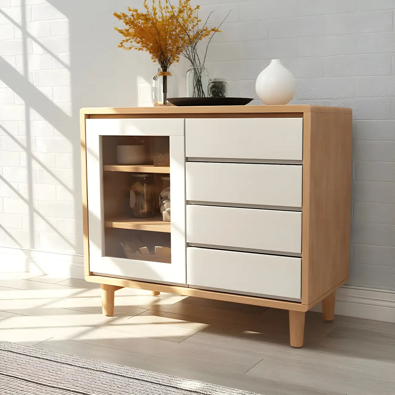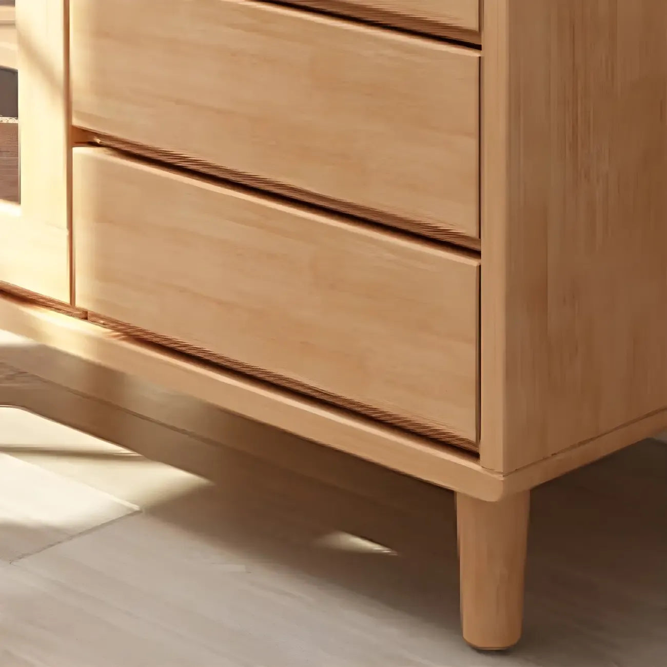 Vitrine en bois clair à plusieurs tiroirs avec portes vitrées