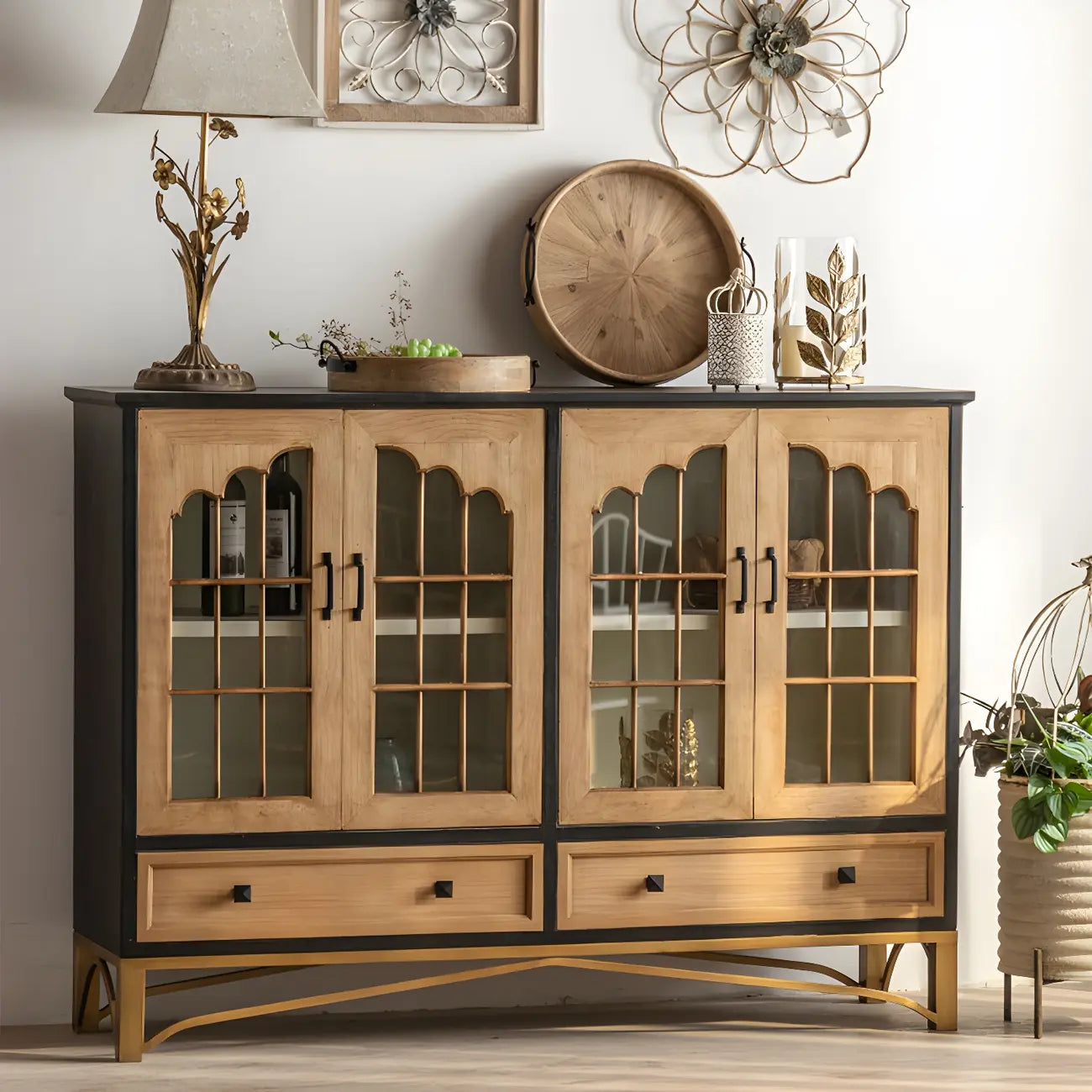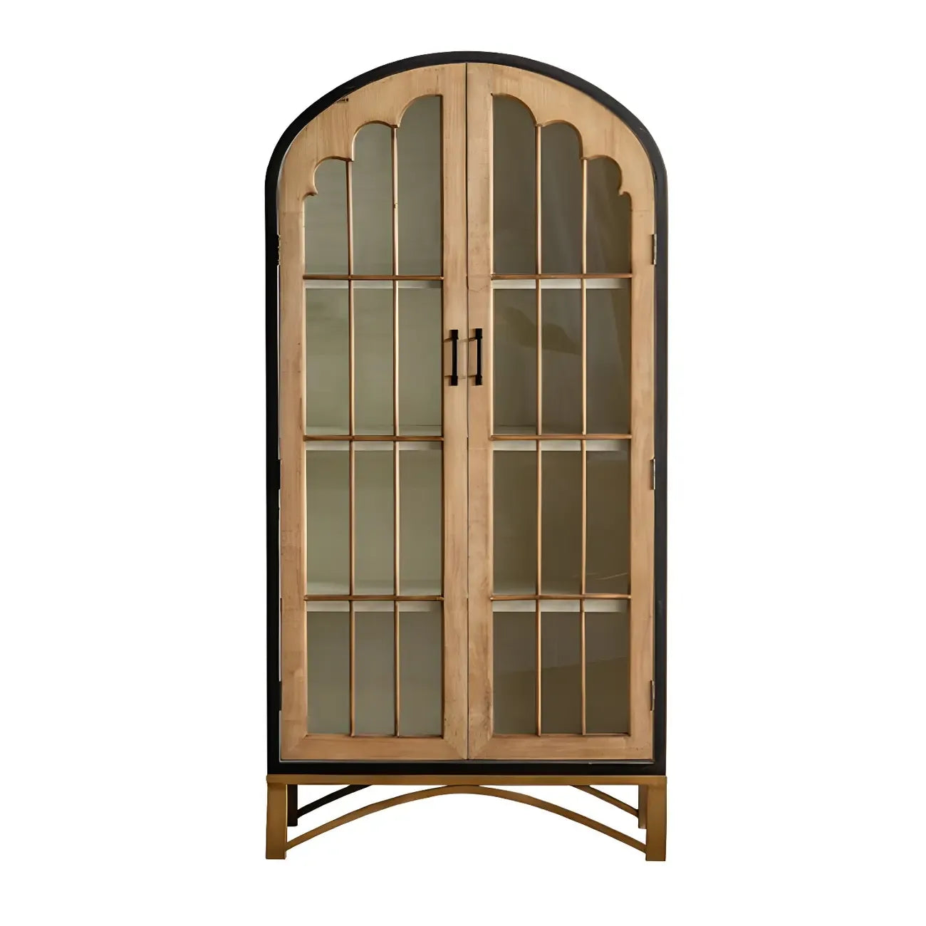 Vitrine en bois naturel avec portes vitrées et tiroirs