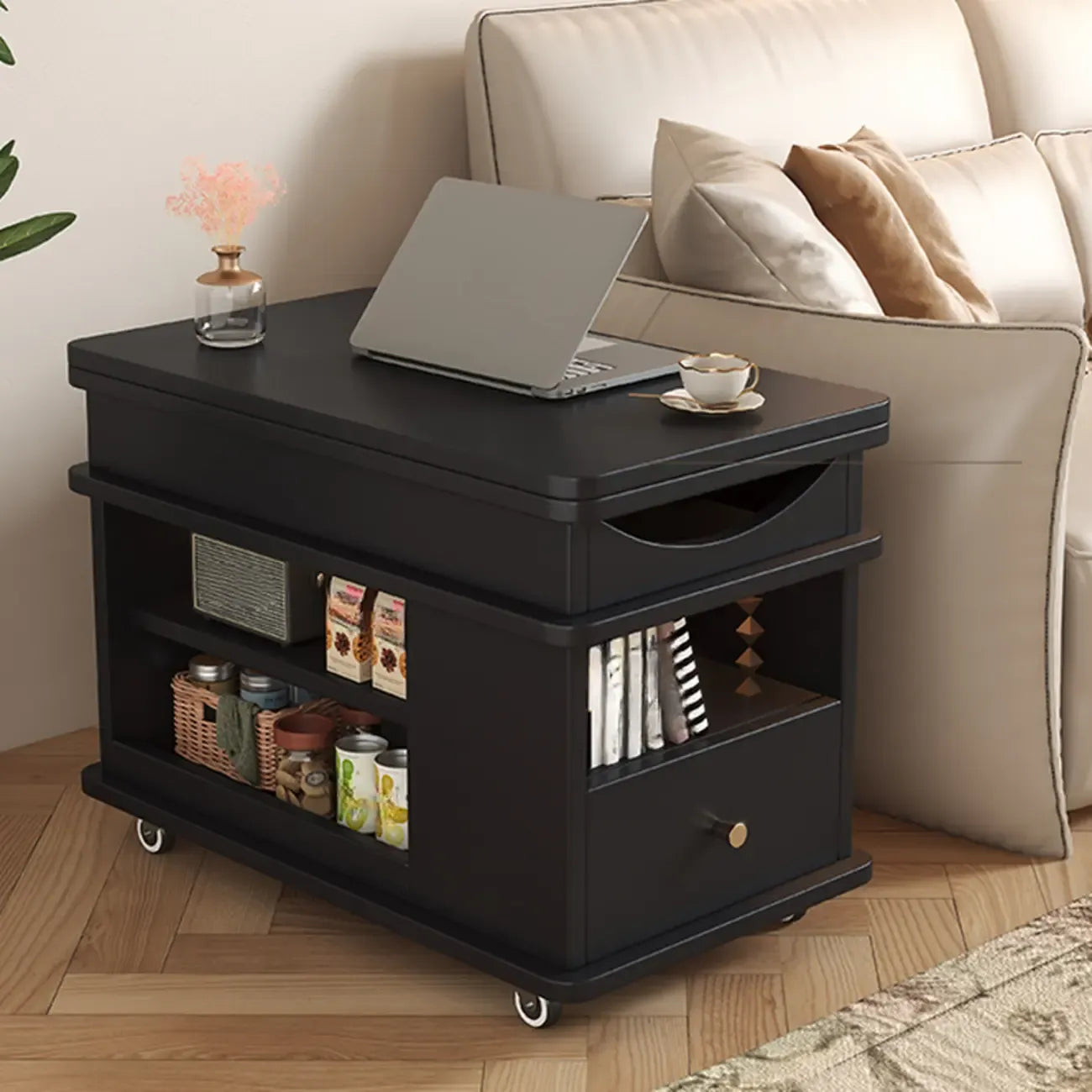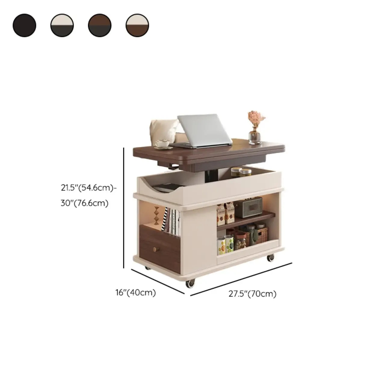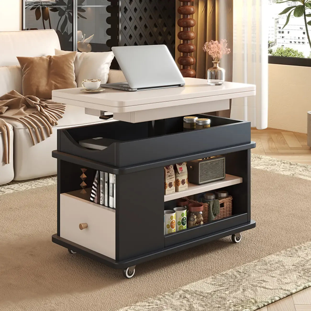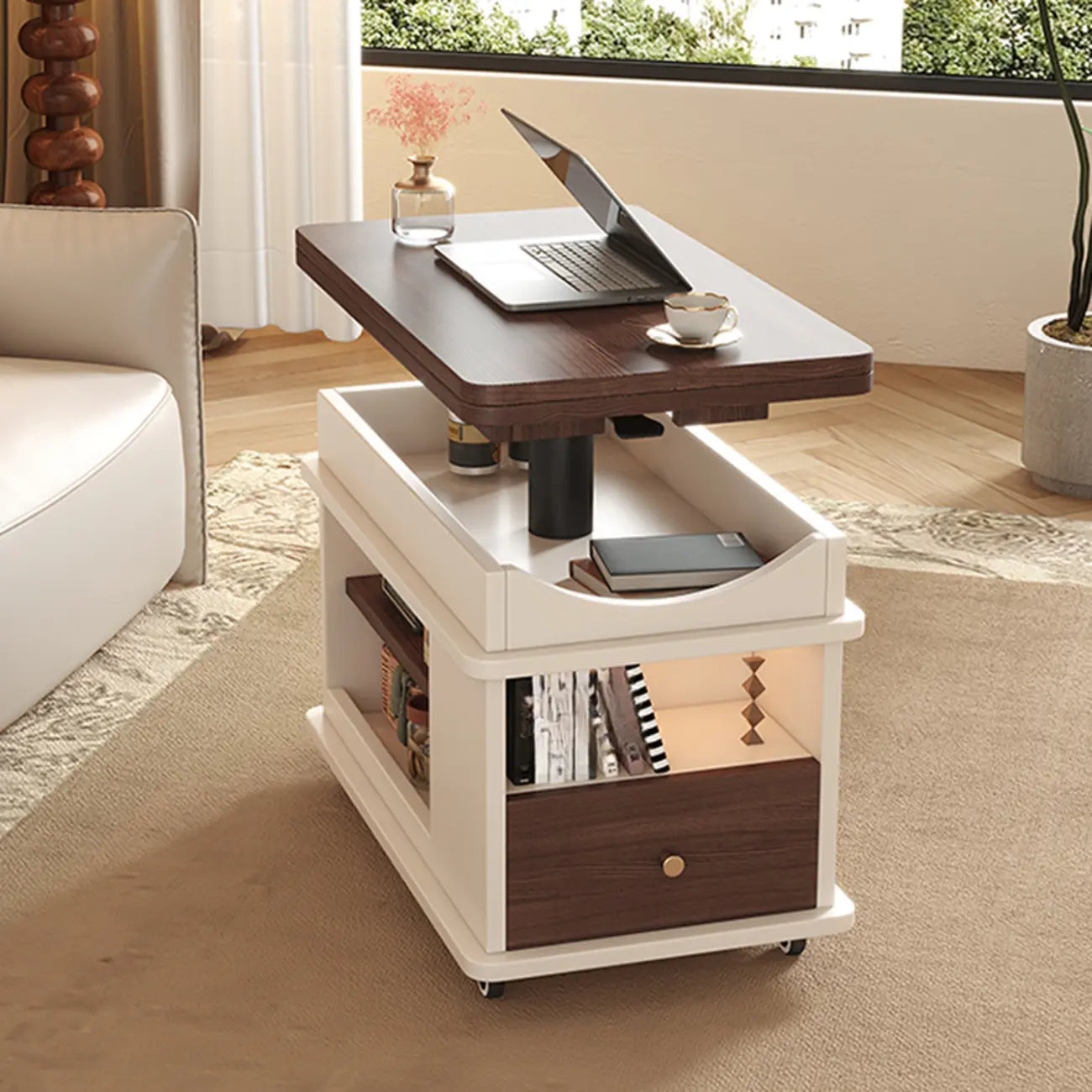 Table d'appoint rectangulaire pliable à plateau relevable en bois et métal avec roulettes