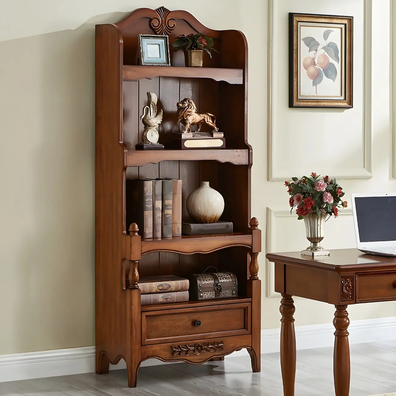 Bibliothèque traditionnelle en bois marron à 3 étagères avec tiroir